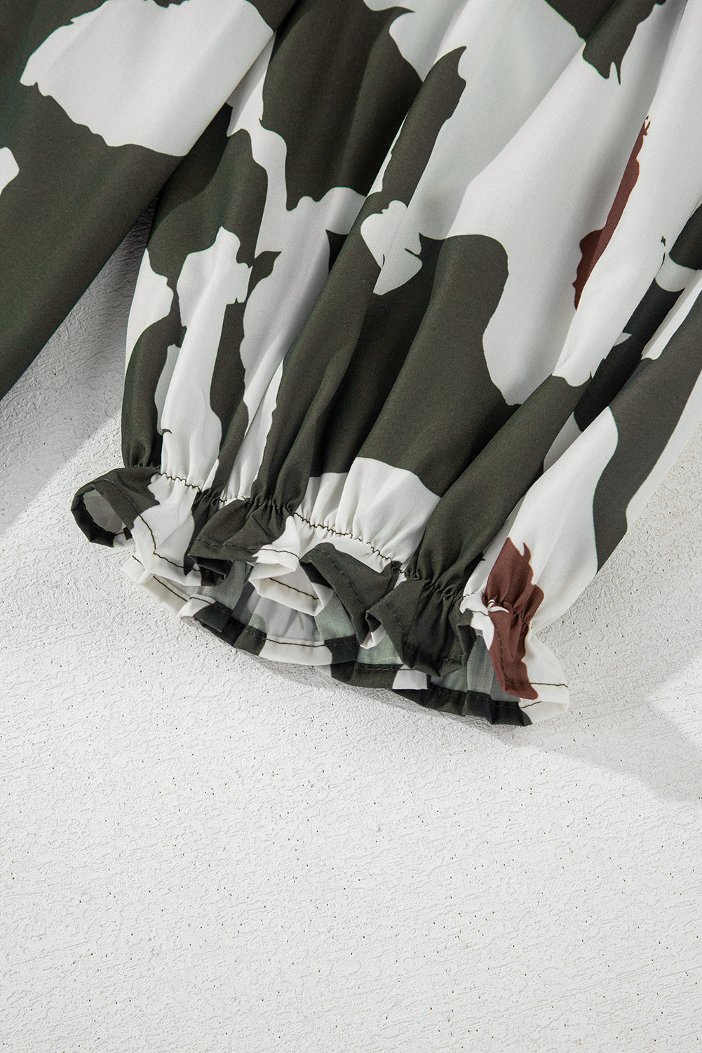 Four Leaf Clover Abstract Floral Print Puff Sleeve Half Button Blouse