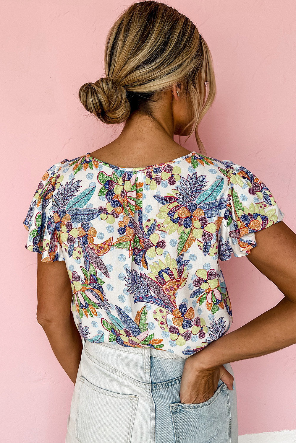 Sky Blue Floral Buttoned Round Neck Ruffled Sleeve Blouse