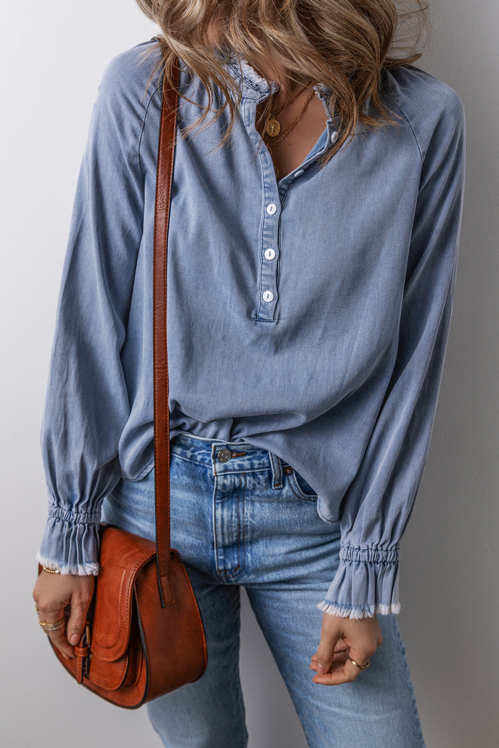 Sky Blue Frilled Raw Hem Half Buttoned Denim Top